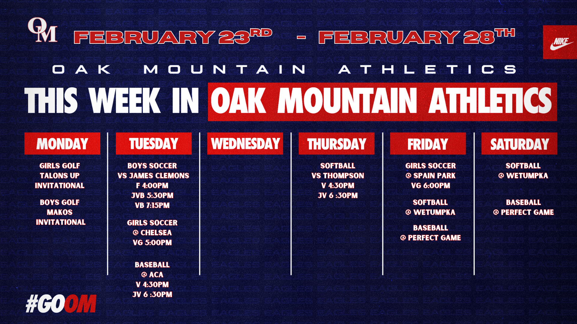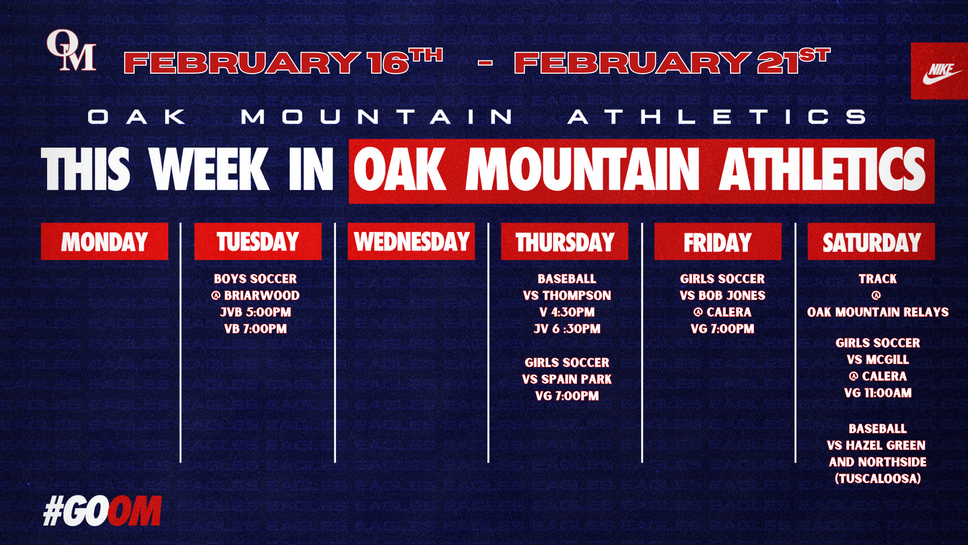 OAK MOUNTAIN ATHLETICS Wrestling wins 7a State championship Read More the eagle eye OMHS STORE OMHS ALUMNI Follow our journey.